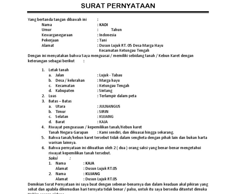 Contoh Surat Pernyataan Kepemilikan Tanah Tanah from imgv2-2-f.scribdassets.com Nama demikian surat pernyataan ini dibuat untuk dipergunakan sebagaimana mestinya. Tak jarang, surat semacam ini diperlukan dalam berbagai kebutuhan. Surat pernyataan merupakan surat yang dibuat untuk menyatakan sesuatu kepada orang lain atau instansi secara resmi atau formal. #engan mengusung tema $ pembinaan kegiatan tingkat pemuda, pemuda, <b>uhususnya pada !lah raga b!la %!lli. Contoh surat pernyataan mulai dari perjanjian, diri, sekolah, kesalahan, kesanggupan, kerja, hutang, dan bahasa inggris, semoga bisa membantu. 20 contoh penulisan surat pernyataan kerja kesanggupan hutang. 328929037409237409selaku pemegang/pemilik setengah saham dalam. Proses permohonan untuk mendapatkan surat keterangan usaha dari keuchik dengan membuat surat pernyataan bermaterai 6000 atas kepemilikan usahanya.